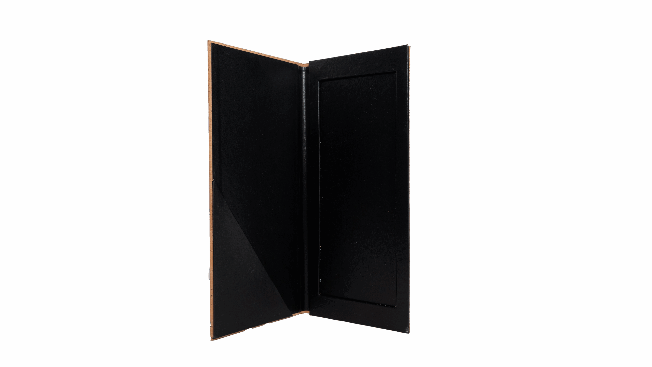 O interior, integralmente em preto, é cuidadosamente organizado: a bolsa tipo envelope, situada na contra capa frontal, acomoda a conta e o cartão de visita do estabelecimento, enquanto a caixa interna ligeiramente elevada (cerca de 0,5 cm) garante que moedas, notas ou cartões se mantenham seguros após o fecho.